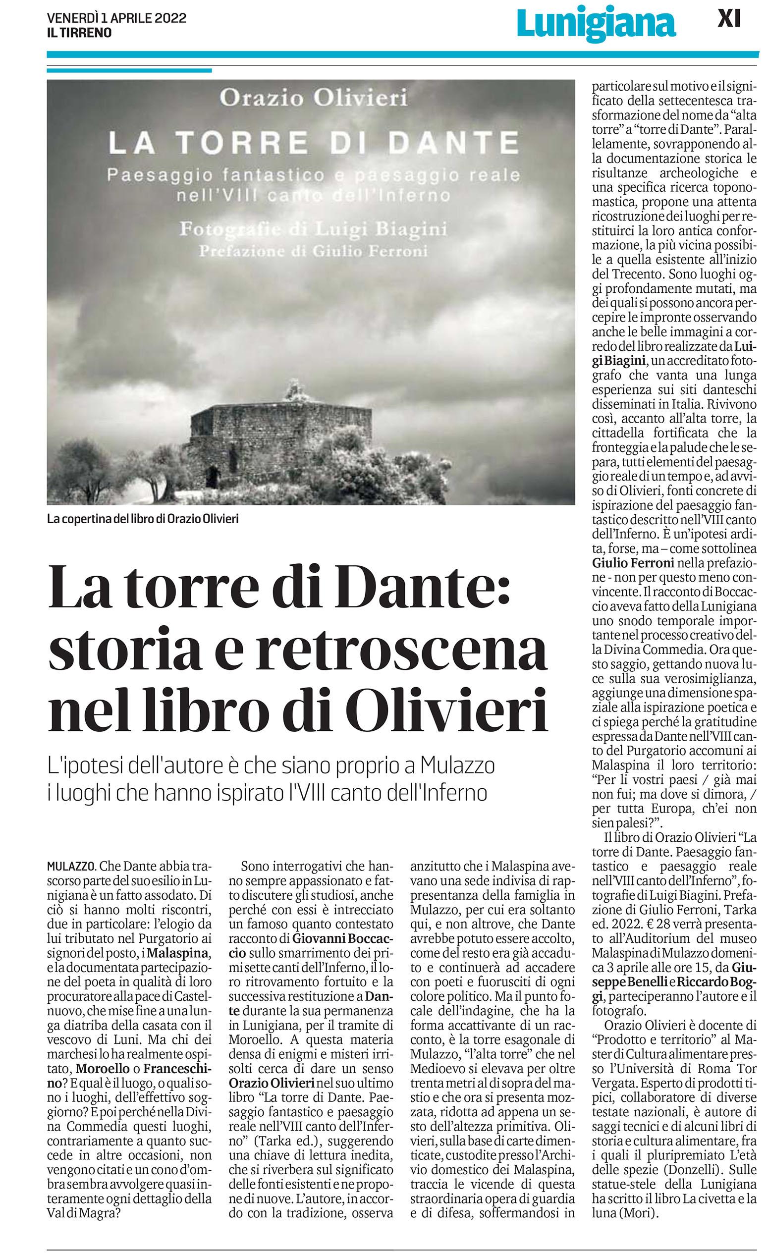 Partendo da un’indagine storica sul perché la “torre di Dante” di Mulazzo porti questo nome e avvalendosi di documenti d’archivio dimenticati nonché di una conoscenza profonda del territorio, e col supporto di suggestive fotografie, l’autore ricostruisce con metodo le basi reali e i motivi concreti dell’ambientazione dell’VIII canto dell’Inferno, recuperando la complessità di una intensa ispirazione poetica e sovvertendo il comune convincimento che il paesaggio fantastico sia una semplice derivazione virgiliana.